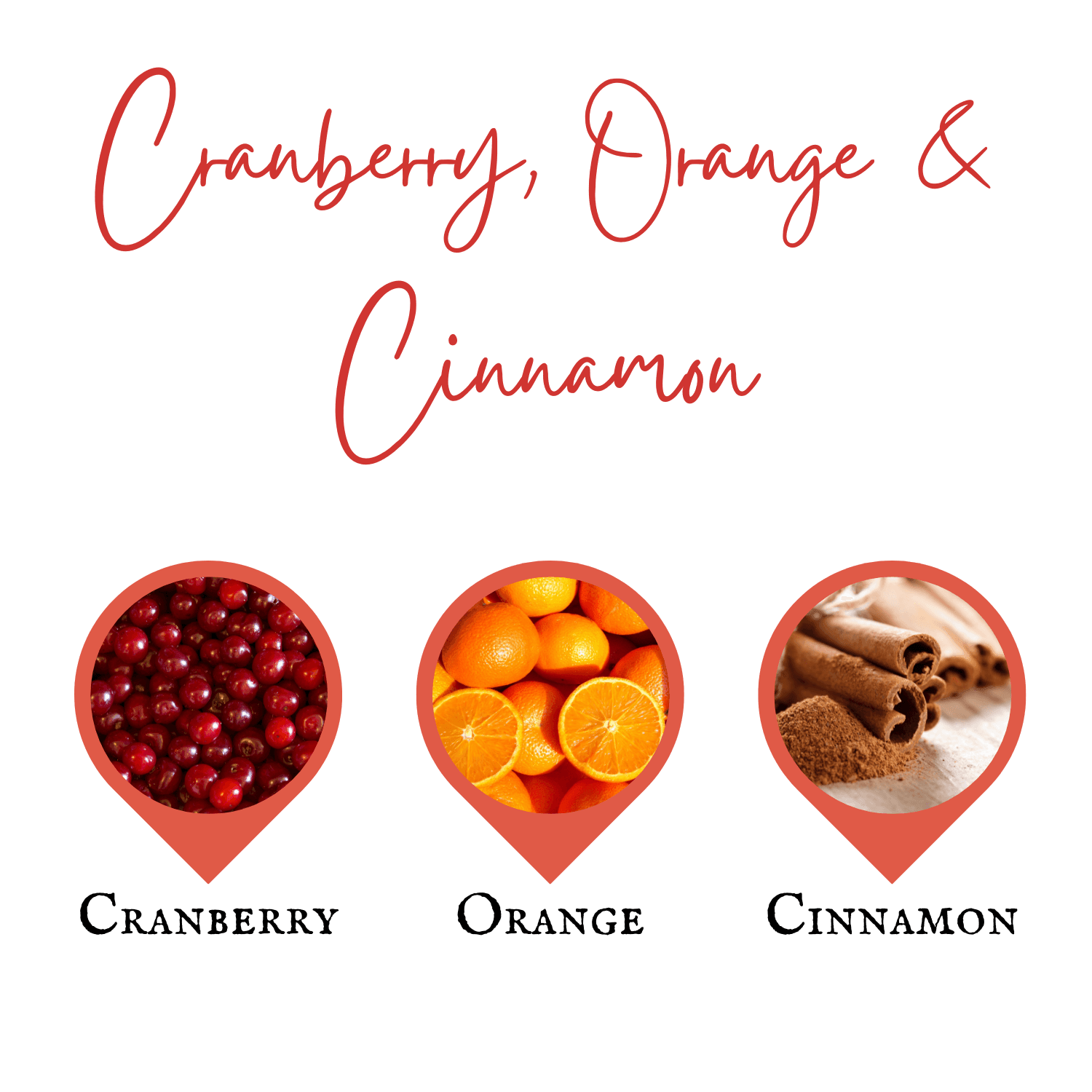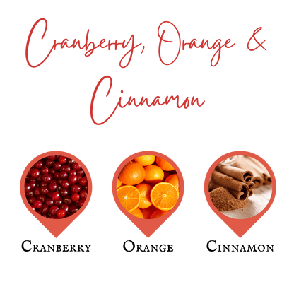 Cranberry, Orange & Cinnamon - WARNING! Contains: 1-(1,2,3,4,5,6,7,8-Octahydro-2,3,8,8-tetramethyl-2-naphthalenyl) ethanone,4-tert-Butylcyclohexyl acetate, Allyl cyclohexanepropionate, Benzyl salicylate, Eugenol, Geraniol, Isoeugenol, Tetrahydrolinalool, alpha-Hexylcinnamaldehyde, delta-1-(2,6,6-Trimethyl-3-cyclohexen-1-yl)-2-buten-1-one, p-Anisyl acetate.